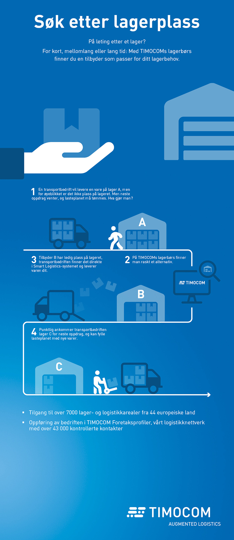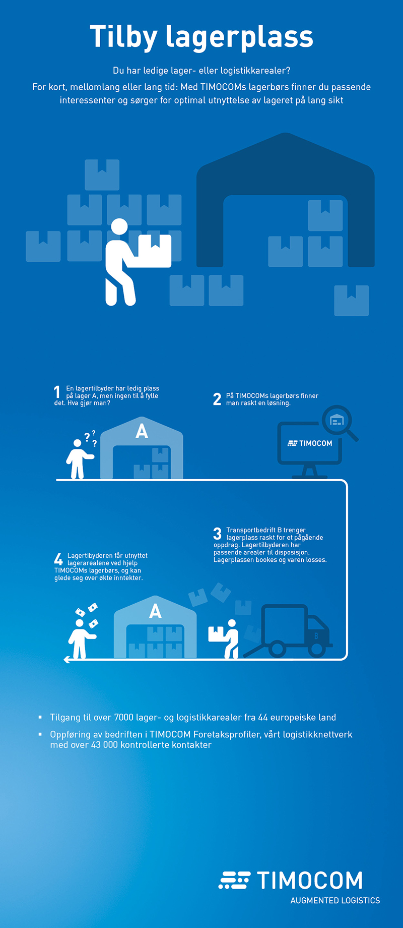 Har du et lager og ønsker å utnytte kapasiteten maksimalt? Eller er du på leting etter en passende lagerplass? Da har vi løsningen for deg: I TIMOCOMs markedsplass tilbyr vi også en lagerbørs. Det er det absolutt største B2B-nettverket med forskjellige lagerarealer og lagertyper i Europa – uten ekstra kostnader. Som bruker av systemet har du automatisk tilgang til lagerbørsen og mer enn 9 000 lager- og logistikkarealer i 46 europeiske land. Avhengig av ditt behov kan du motta eller legge inn tilbud om lager, og komme i direkte kontakt med potensielle forretningspartnere.